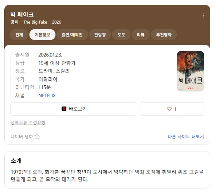 NEW HOT 영화 #페이크 #1970년대 #로마 [빅 페이크] 1970년대 로마 그림 위조범 모작의 대가가 되다 자체.. pksy2313 2026-04-24 5,340 조회 235 좋아요 다운로드 파일 (1개) [빅 페이크] 1970년대 로마 그림 위조범 모작의 대가가 되다 자체자막 1.9G 다운로드 추천 235 북마크 공유 목록 개인 소장 목적으로만 이용 가능합니다. 재배포·상업적 이용 금지. TAGS #페이크 #1970년대 #로마 #그림 #위조범