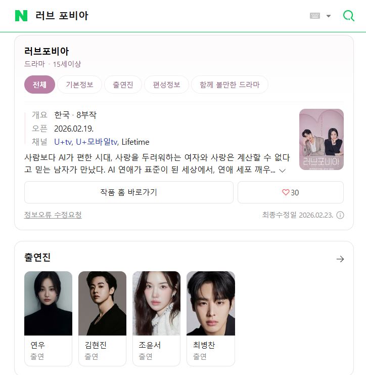 드라마 #러브포비아 #E01 #E08 1080p 러브포비아 E01-E08 통합3 연우 김현진 조윤서 [완결] 하늘아래소 2026-04-22 4,403 조회 267 좋아요 다운로드 파일 (1개) 1080p 러브포비아 E01-E08 통합3 연우 김현진 조윤서 [완결].mp4 4.3G 다운로드 추천 267 북마크 공유 목록 개인 소장 목적으로만 이용 가능합니다. 재배포·상업적 이용 금지. TAGS #러브포비아 #E01 #E08 #통합3 #연우
